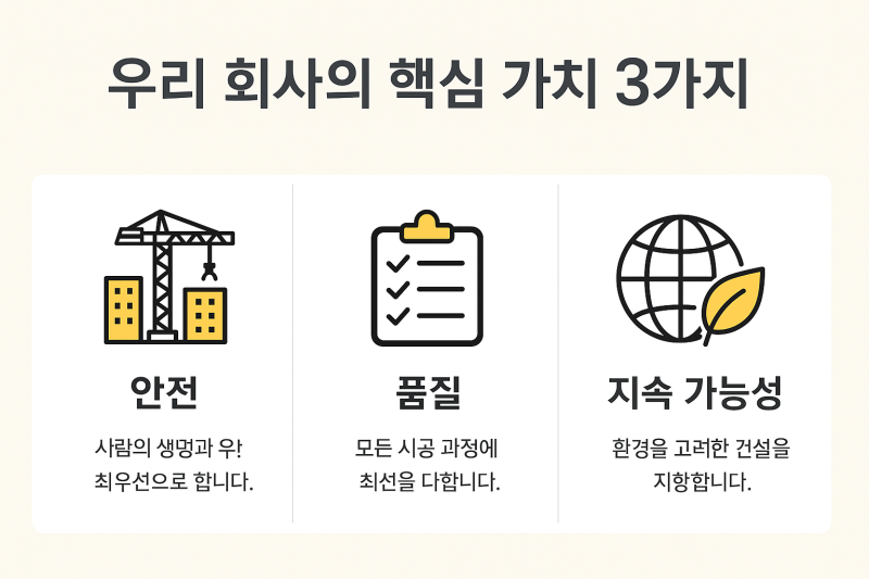 저희 **[가상의 건설사 이름]**는 창립 이래 변함없이 지켜온 세 가지 핵심 가치를 바탕으로 모든 프로젝트를 수행하고 있습니다.